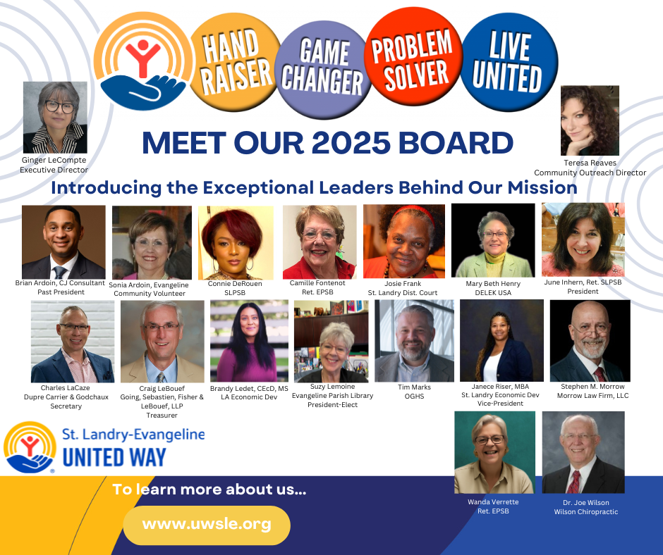 St. Landry-Evangeline United Way is governed by a volunteer Board of Directors representing the communities we serve. The diversity of our volunteers is the key to our strength and effectiveness. We rely on their wisdom, their experience and their passion to advance the common good in St. Landry and Evangeline parishes.